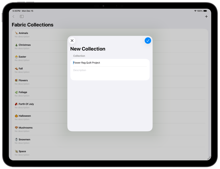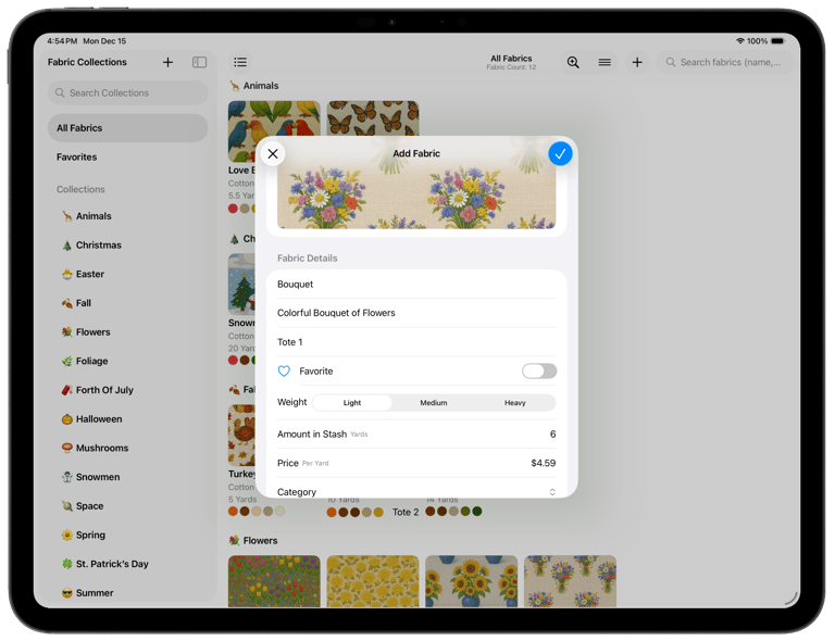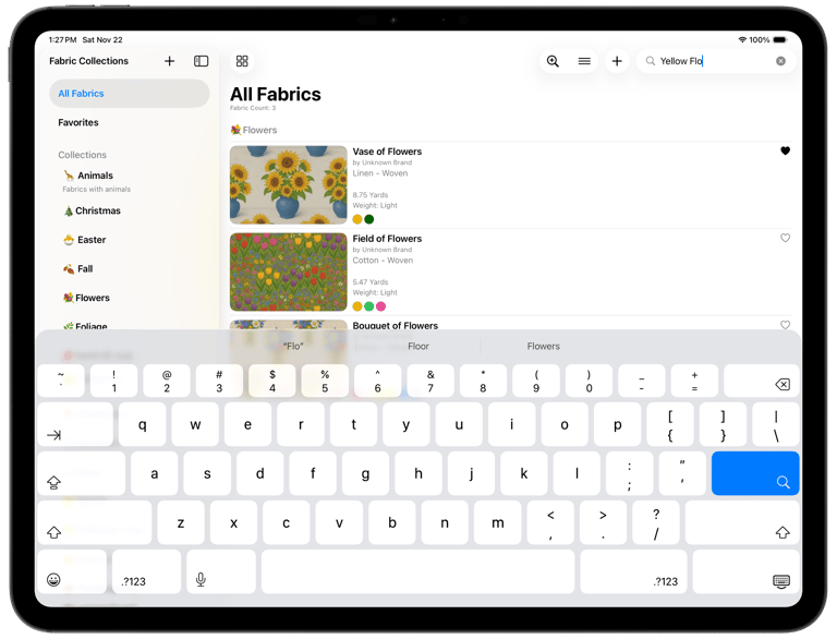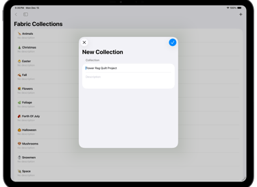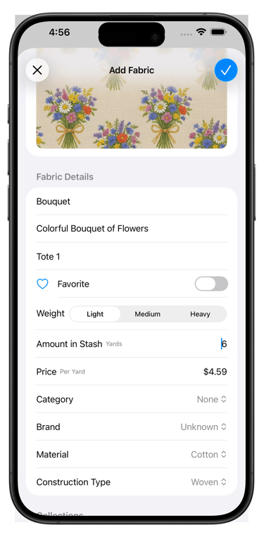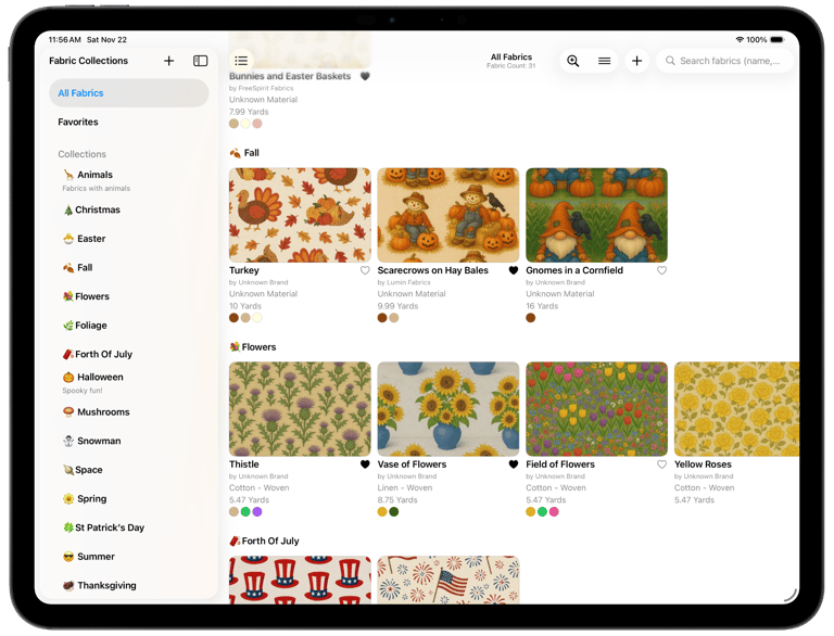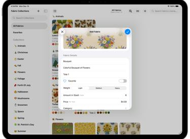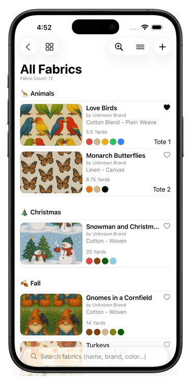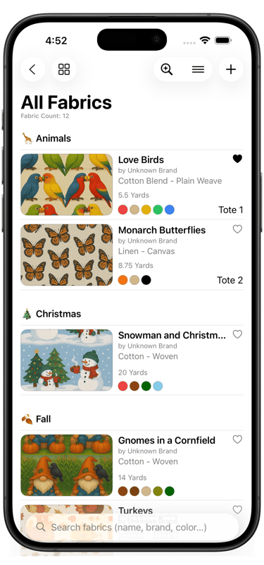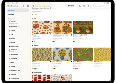 Fabricora is your all-in-one companion for managing your fabric stash with clarity and ease — available for both iPad and iPhone. Whether you’re a quilter, sewist, or fabric lover, Fabricora helps you photograph your fabrics, record important details, and organize everything into beautiful, searchable collections.