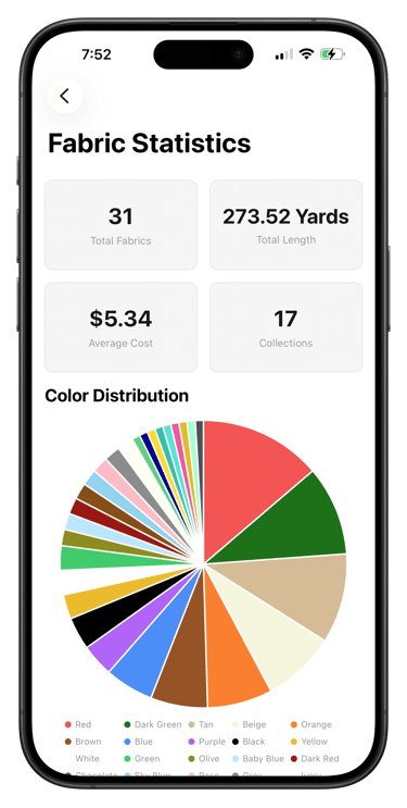 Your personalized dashboard provides helpful insights like color distribution, total yardage/meters, average price, and collection breakdowns, giving you a deeper understanding of your stash at a glance.