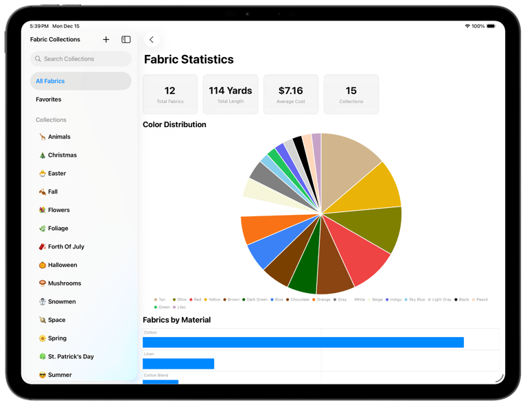 Material & Category Breakdown: Understand what you collect most—cotton, linen, knits, scraps, precuts, and more